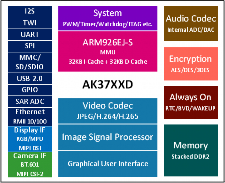 -安凯AK37D系列处理器采用ARM926EJ-S内核,集成DDR2 SDRAM存储器、摄像头接口、图像处理器、视频编码预处理器、视频编解码器、音频ADC/DAC、USB2.0主从控制器、MMC/SD/SDIO控制器以及丰富的外设接口,具有很高的集成度,大大降低了产品的功耗和物料成本,同时具备高性能的多媒体处理能力。