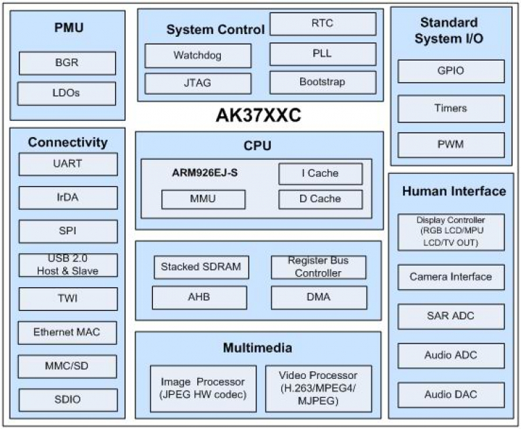 安凯AK37C系列处理器采用ARM926EJ-S内核,内置SDRAM,终端产品无需外挂RAM存储器。AK37C系列处理器支持MPEG4、MJPEG编解码,集成CMOS摄像头接口、电源管理电路、音频ADC/DAC、USB2.0主从接口、MMC/SD接口、LCD显示接口、Ethernet MAC接口、SPI接口以及其它丰富的功能模块和接口,具有极高的集成度,大大简化了终端产品的设计复杂度,降低了产品成本,提高了产品可靠度。