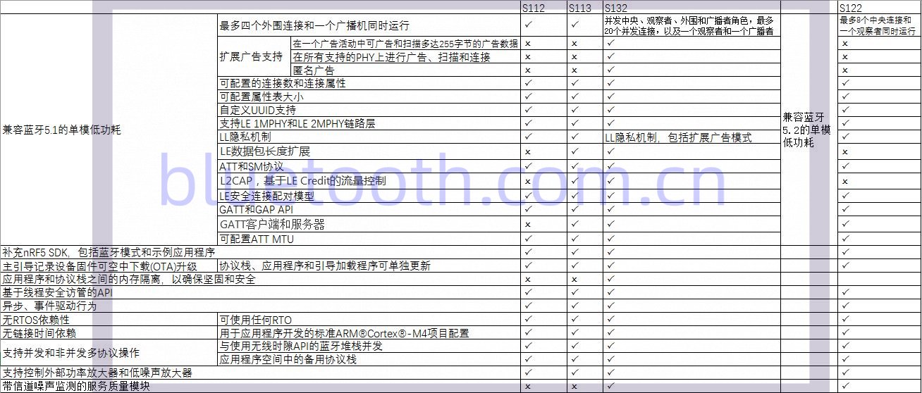 S112、S113、S132、S122都是低功耗单模蓝牙协议栈。 S112、S113、S132兼容蓝牙5.1版本; S122兼容蓝牙5.2版本。 具体特性差别可参看下表: 更多Nordic Softdevice 协议栈简介可参考以下链接